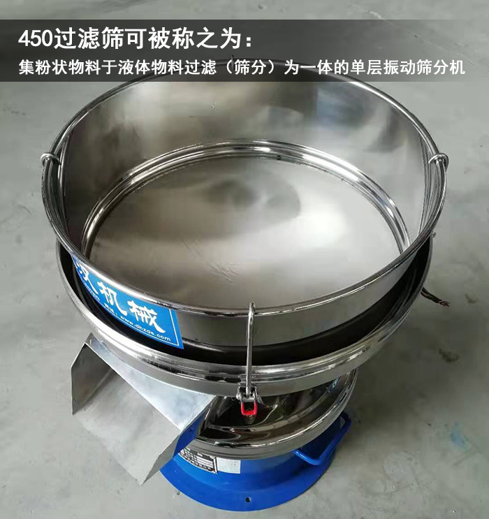 450過濾篩其粉狀物料的篩分可篩分:大顆粒含量的粉末篩分與漿液過濾;325目過濾比重1.1的物料,每小時可達1200公升,30目篩分面粉每小時可處理700公斤。不知這樣的物料篩分量能否符合你的需求。