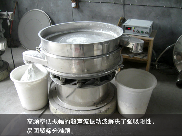 超聲波震動篩是旋振篩的一種衍生產品,是將超聲波控制器于旋振篩有機結合在一起,在篩網上面疊加一個高頻率低振幅的超聲波振動波,超微細粉體接受巨大的超聲波加速,使篩面上的物料始終保持懸浮狀態,從而仰制黏附,摩擦,平降,楔入等堵網因素,從而解決了強吸附性,易團聚,高靜電,高精細,高密度,輕比重等篩分難題,使超微細粉篩分不再成為難事,特別適合高品質,精細粉體的用使用。